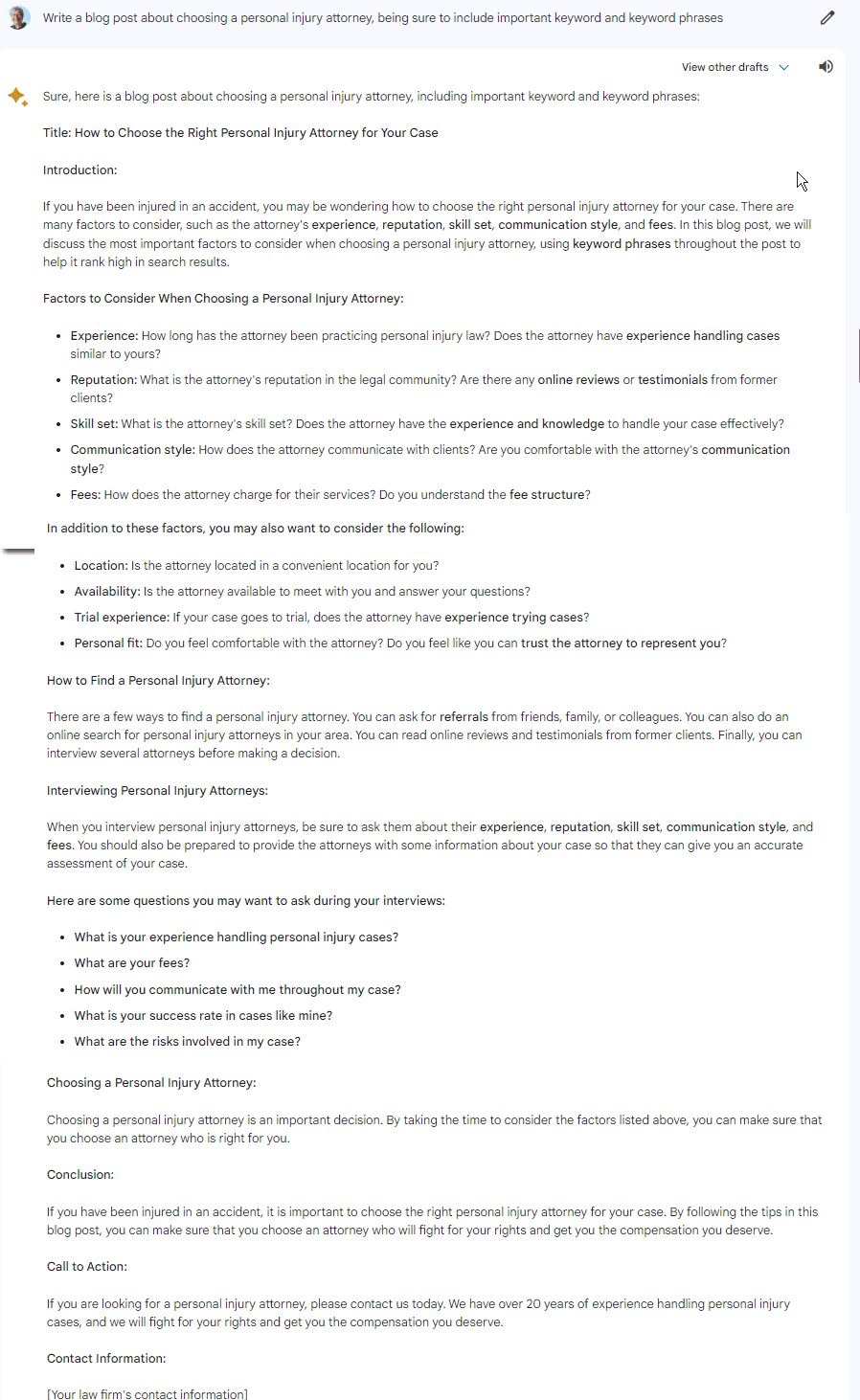 To show you how well this can work, I chose a topic I’ve never researched and know nothing about – Choosing a Personal Injury Attorney. I used both Bard (which is free) and the free version of ChatGPT (GPT-3.5) to see what each would produce. I used this same prompt on both services:
